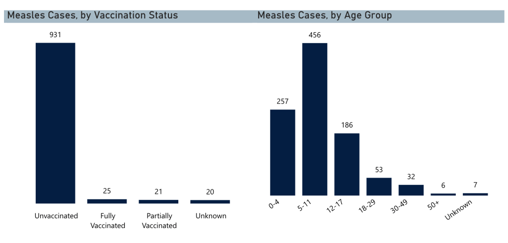 In Spartanburg County, the outbreak center for South Carolina, over 700 of the approx. 1000 cases were of children under 17 years old, with 456 in the 5-11 age range. This proves that measels cases have been spreading through daycare centers and facilities with a large amount of young children. Across all age groups, over 90% of infections were of unvaccinated people. It is worth noting that 21 of all infected cases are only partially vaccinated, so getting the required number of doses is crucial. As of March 28th, South Carolina had not had new cases of measels for over a week, signaling process.